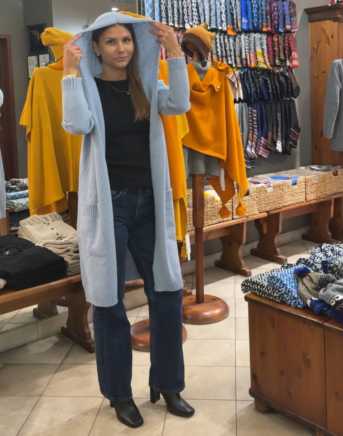 Silts un mīksts adīts kardigans ar kapuci un lielām kabatām. Garais dizains nodrošina papildu siltumu un komfortu vēsākās dienās. Brīvais piegriezums ļauj to viegli kombinēt ar ikdienas apģērbu — ideāli piemērots pastaigām vai mājīgiem brīžiem mājās.