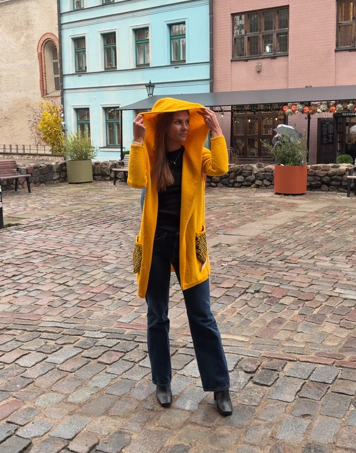 Silta un ērta vilnas jaka ar rakstainām kabatām un kapuci. Dabiska vilna nodrošina komfortu un siltumu, vienlaikus saglabājot vieglumu un elpojošu sajūtu.