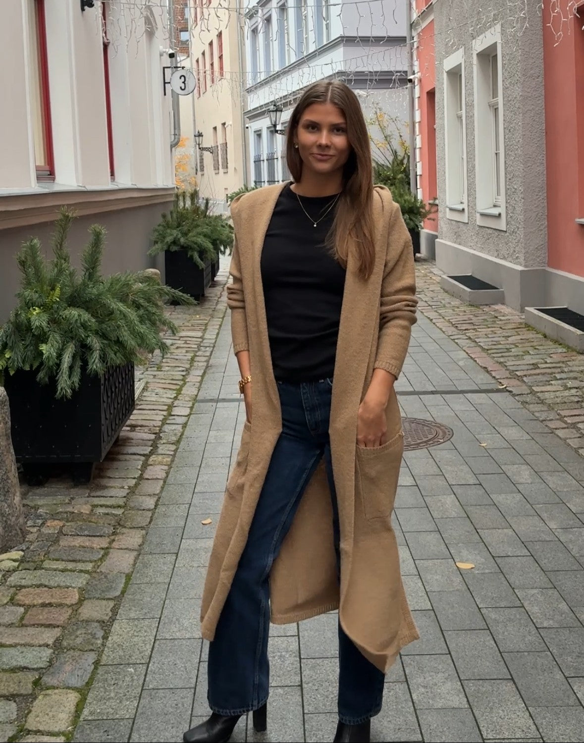 The long cut, spacious pockets, and comfortable hood add both elegance and practicality.